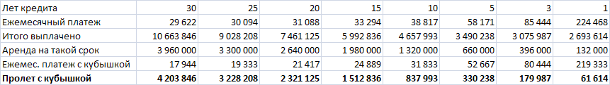 Поигравшись с числами я выяснил, что при покупке моей квартиры мне имеет смысл брать ипотеку, только если мне не хватает примерно миллиона. В других случаях – нафиг-нафиг. И еще выяснилась интересная вещь: когда сумма кредита невелика, выгодно брать его на долгий срок. Но обычно, кредиты на много лет – большущий пролет по деньгам.