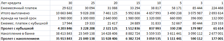 В случае с кубышкой мы деньги просто экономим, в случае с накоплением на счете мы деньги зарабатываем. Положительный “пролет с кубышкой” показывает, что нам в кубышку надо откладывать меньше денег, чем на ипотеку даже с учетом аренды равнозначной квартиры.
