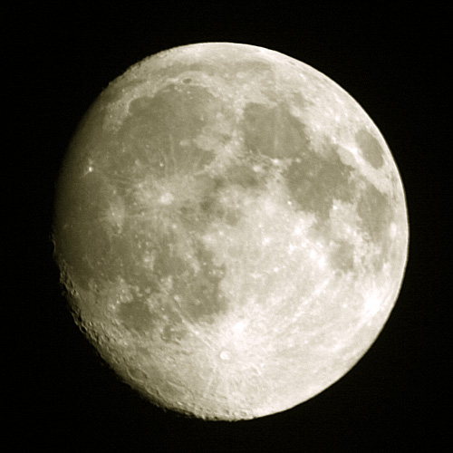 Луна сегодня красивая в небе висит. Появилась еще непоздним вечером и меня все тянуло ее сфотографировать. Поленился, о чем жалею. Зато когда стемнело, специально съездил, снял ее покрупнее (хотя сейчас у нее не самая фотогеничная фаза для этого):