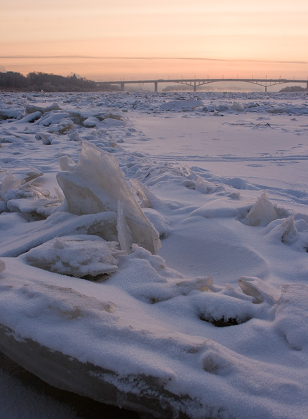 В этом году Иртыш замерзал с приключениями. С верховий шли льдины, которые здесь образовывали торосы, и все это сверху прихватило морозцем. Поэтому река покрыта не ровным льдом, а каким-то ледяным безумием: