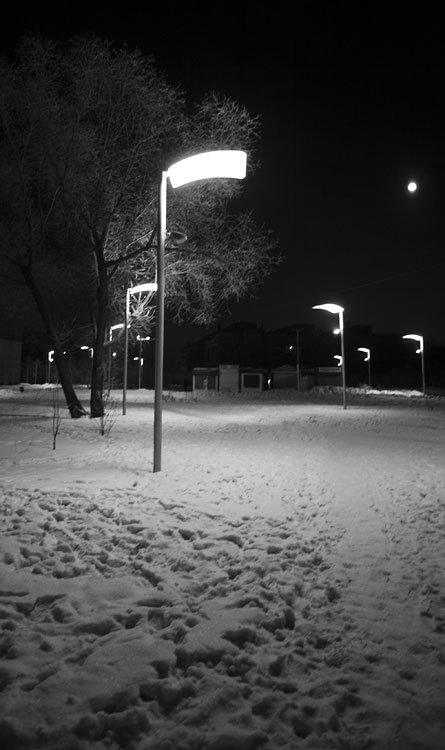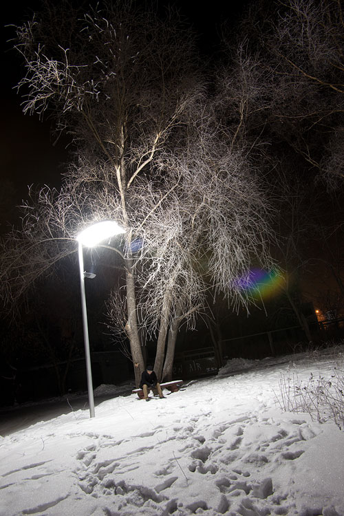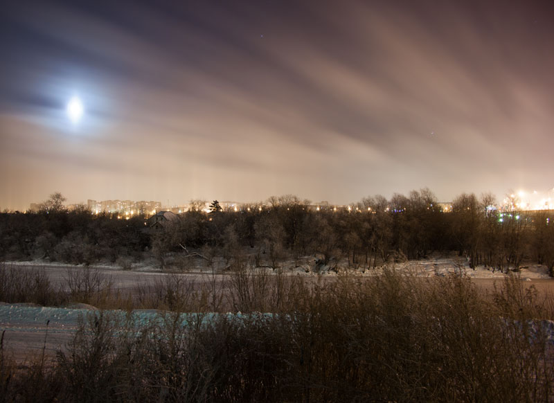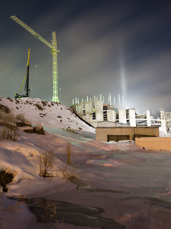 Давно хотел снять гало в виде столбов света, поэтому, когда увидел ночью это явление, побежал фотографировать. Сфотографировать столбы, как обычно, гораздо сложнее, чем увидеть, но что-то получилось: