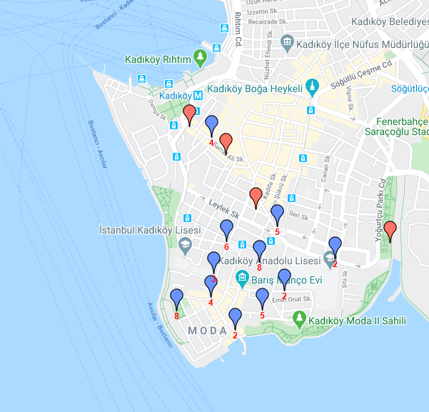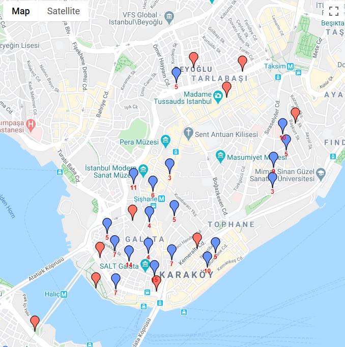 Вы уже устали читать про стамбульское граффити? Возможно, проще будет вам просто съездить на место и поглядеть всё своим глазами. Самая большая концентрация интересных граффити – на европейском берегу, в Галате. Вот карта, где фиолетовые отметки показывают места концентрации работ (число снизу – это как раз количество граффити, которое я нашёл):